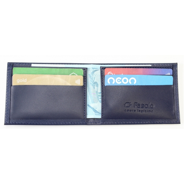 Carteira em couro Veneza e Soft Anil, possui 4 porta cartões e porta notas.Procuramos agregar nos modelos clássicos, com couro tradicional em uma combinação de cores e texturas emborrachadas, dando um ar mais moderno ao modelo. Nossas carteiras são feitas manualmente pelos melhores artesãos, com cuidado em Todos os detalhes, garantindo o alto padrão de qualidade.Carteiras fabricadas com couro certificado de alta qualidade, adquiridos dos melhores produtores.Com mais de 100 anos de tradição, a Fasolo é a marca mais tradicional de acessórios em couro do Brasil.